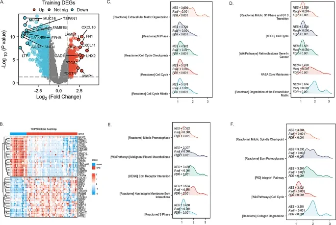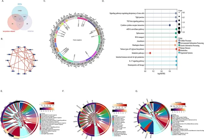 基于NPC数据集筛选差异基因,获得1058个DEGs,富集分析显示DEGs主要参与“细胞间信号传导和相互作用”以及“免疫微环境”等途径(图2)。WGCNA分析获得了372个与NPC相关的关键模块基因(图3),与DEGs和LRG取交集,得到17个乳酸相关差异表达基因(LR-DEG)。随后对17个基因进行PPI网络构建和GO、KEGG富集分析,显示其主要富集于免疫相关通路和功能(图4)。