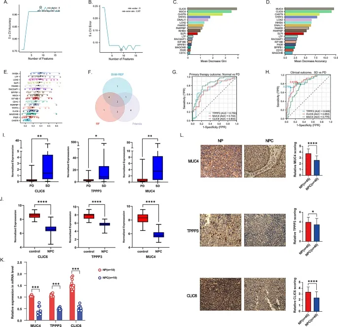 2. 基于17个LR-DEG利用3种机器学习算法筛选到3个具有较强诊断和预测价值的核心基因作为NPC的乳酸相关生物标志物,并在临床样本中验证其表达