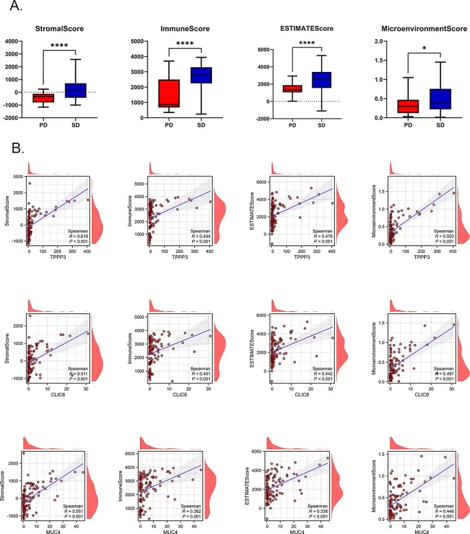 4. 免疫浸润分析发现M0 和 B 巨噬细胞,以及免疫相关评分与3个生物标志物密切相关,表明其与肿瘤微环境之间存在关联