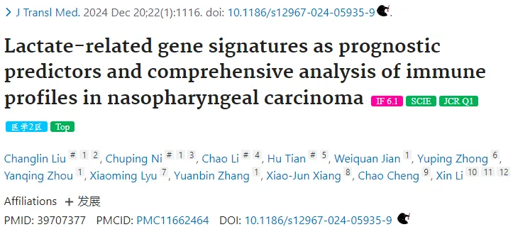 题目:乳酸相关基因特征作为鼻咽癌预后预测因子和免疫谱的综合分析