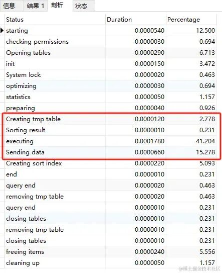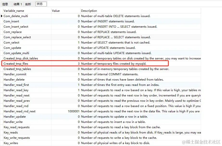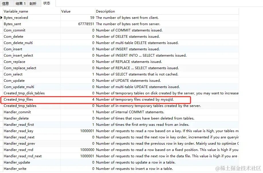 我发现86%的时花在数据传输上,接下来我们看状态部分,关注Created_tmp_files和sort_merge_passes