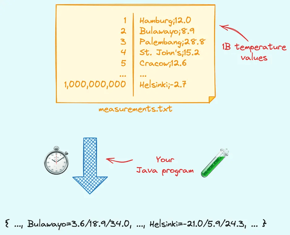 13、1brc :挑战 Java 处理 10 亿行文本的最快速度。这是一个有趣的 Java 编程挑战,要求开发者编写一个 Java 程序,读取包含多个气象站温度值的文件(10 亿行),然后计算每个气象站的最小、平均和最大值,最后按照站点名称排序后输出,目前最快速度不到 2 秒。