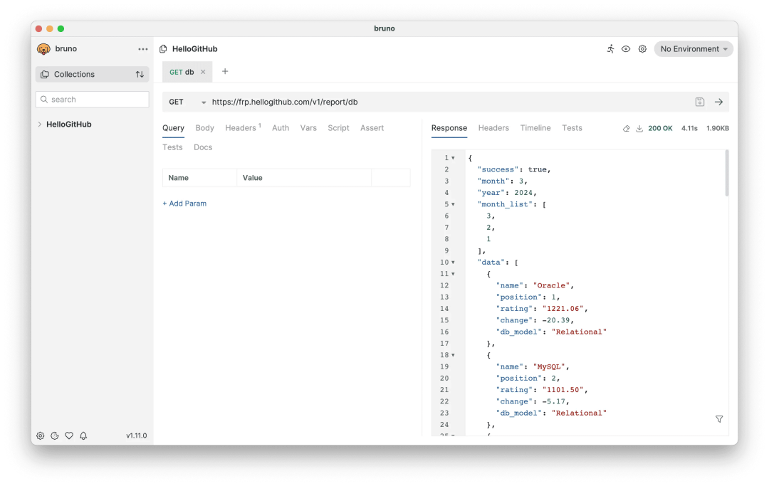 20、bruno :无需登录、免费的 API 客户端。这是一款仅限离线使用(无需登录)的 API 客户端桌面工具,可用来测试和请求 API。它不同于日益臃肿、同类型的 Postman 等工具,你可以直接在本地管理接口信息和数据,没有杂七杂八的账号管理、代理请求、云同步等功能,简单直接、开箱即用的 API 客户端,适用于 Windows、macOS 和 Linux 操作系统。