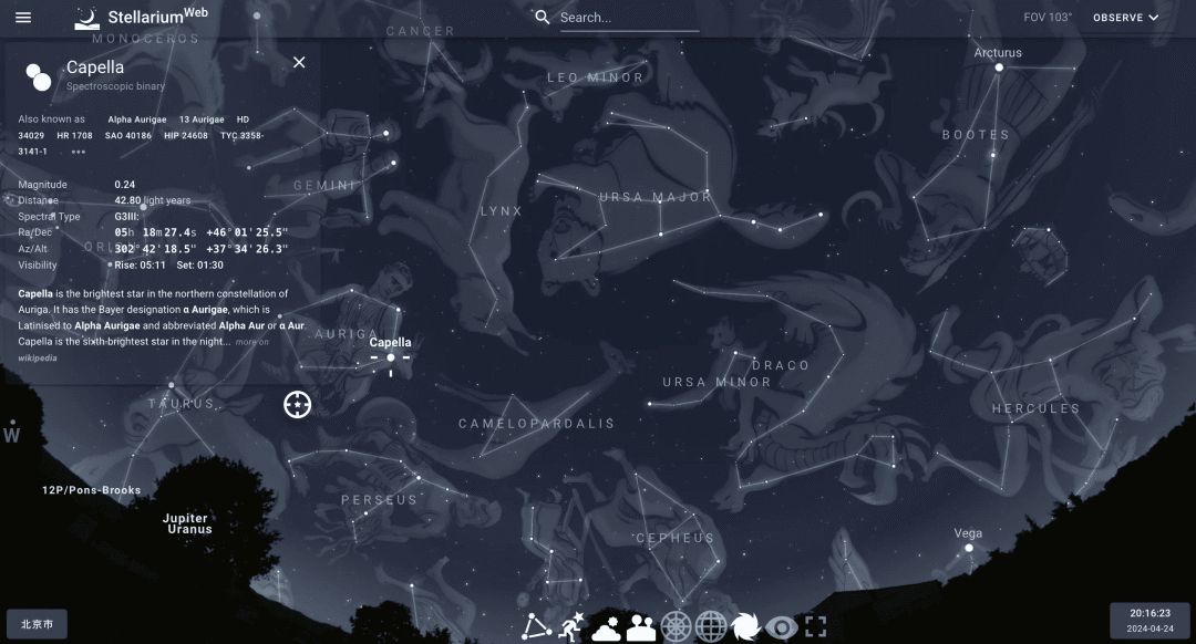 2、stellarium :一款开源的天象模拟软件。该项目是天文爱好者必备神器,它能够精确地模拟/展示出头顶星空的景象,包括恒星、星座、行星、彗星等天体,支持选择时间和地点、放大观察、图解星座等功能,提供了 Windows、Linux、macOS、iOS 和 Android 在内的多个平台客户端。