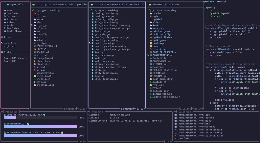 Go 项目 6、superfile :非常漂亮的终端文件管理器。这是一个现代终端文件管理器,为命令行文件操作提供了一个直观且漂亮的界面。它默认采用 Vim 风格的快捷键操作,还支持插件和主题自定义。