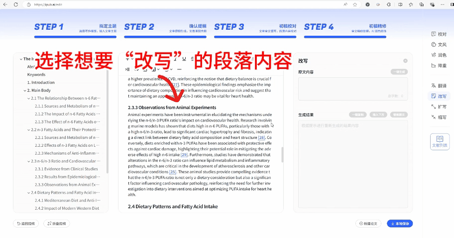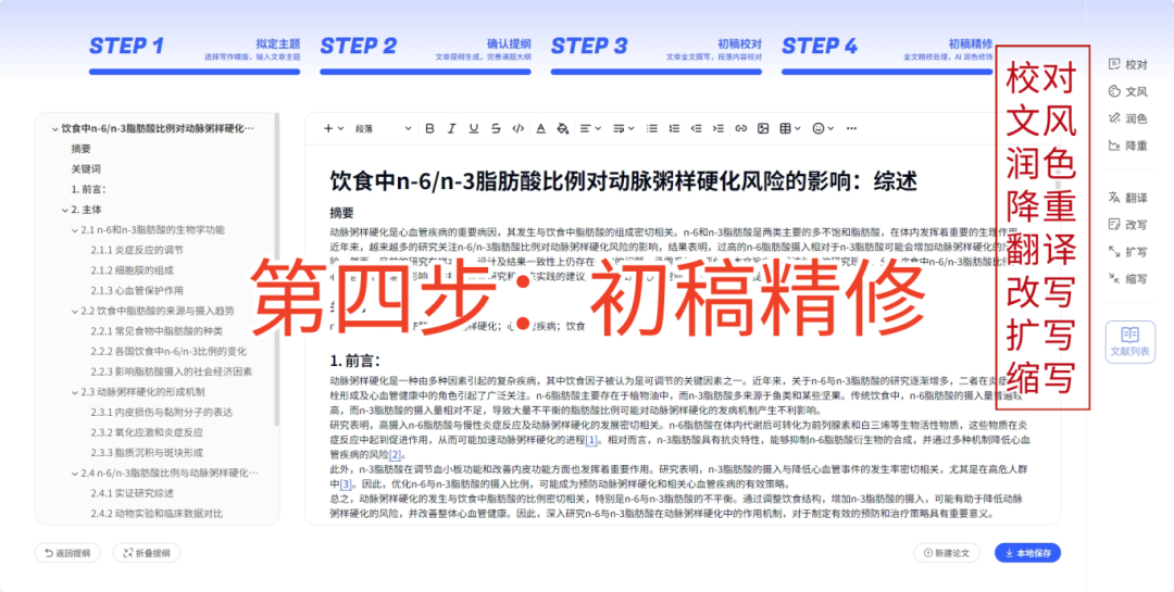 一站点、分步式综述写作:集合了大纲生成、全文生成、文章精修润色等功能,轻松输出综述全文!