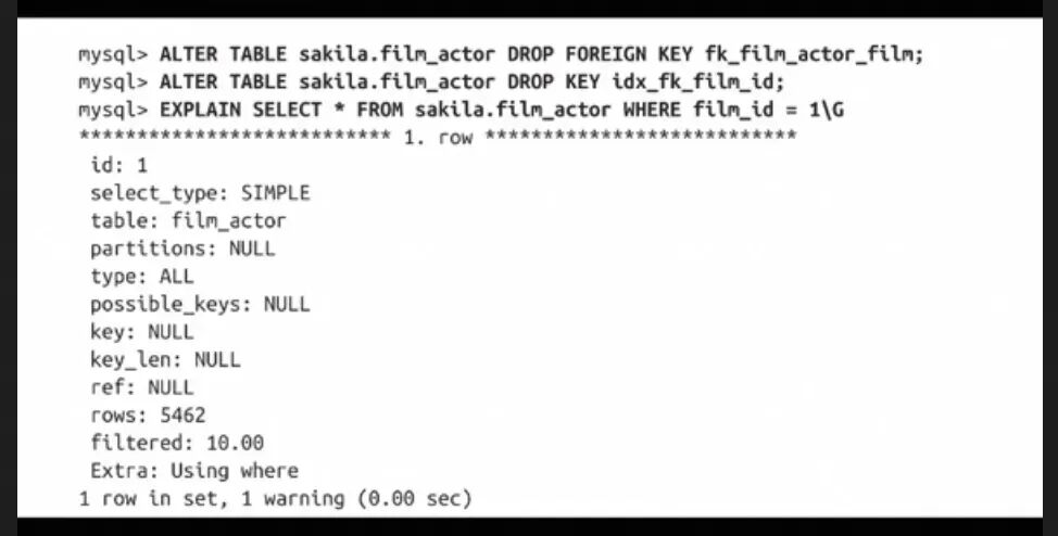 EXPLAIN的结果还显示MySQL预估需要访问10行数据。换句话说,查询优化器认为这种访问类型可以高效地完成查询。如果没有合适的索引会怎样呢?MySQL就不得不使用一种糟糕的访问类型,下面来看看如果删除对应的索引再来运行这个查询会发生什么情况:
