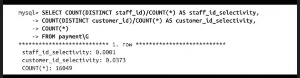 是应该创建一个(staff_id、customer_id)索引还是应该颠倒一下顺序?这时,可以通过运行某些查询来确定在这个表中值的分布情况,并确定哪列的选择性更高。先用下面的查询预测一下,看看各个WHERE条件的分支对应的数据基数有多大: