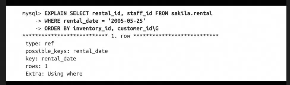 - 这个查询在inventory_id列上有多个等于条件。对于排序来说,这也是一种范围查询(索引顺序:rental_date,inventory_id,customer_id):