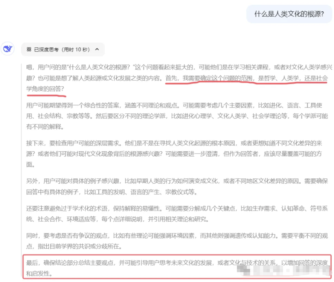 而DeepSeek虽然展示的思考过程更细致,但是也是差不多思路: