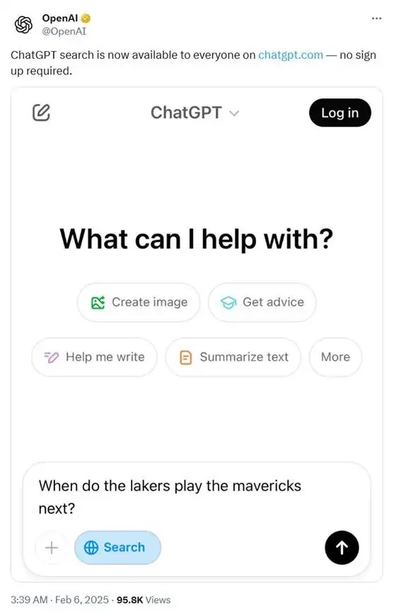 北京时间2月6日凌晨,OpenAI宣布向所有用户开放ChatGPT搜索功能,无需注册。