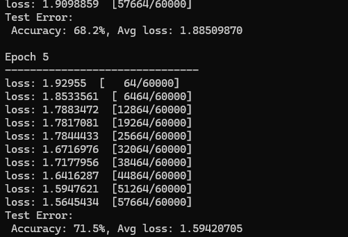 test_loss /= num_batches ; correct /= size ; Console . WriteLine ( "Test Error: \n Accuracy: {(100 * correct):F1}%, Avg loss: {test_loss:F8} \n" ); } 下图是后面训练打印的日志,可以看出准确率是逐步上升的。