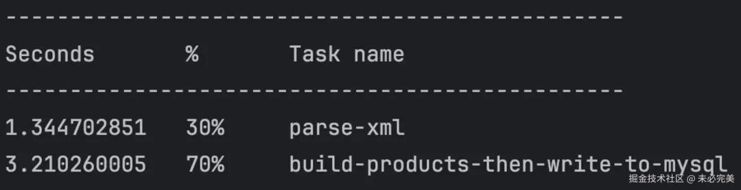 其中 parse-xml 和 build-producs 可以合并,统一看作解析 XML 文件,相对于写入 MySQL 的耗时,这部分简直微不足道。