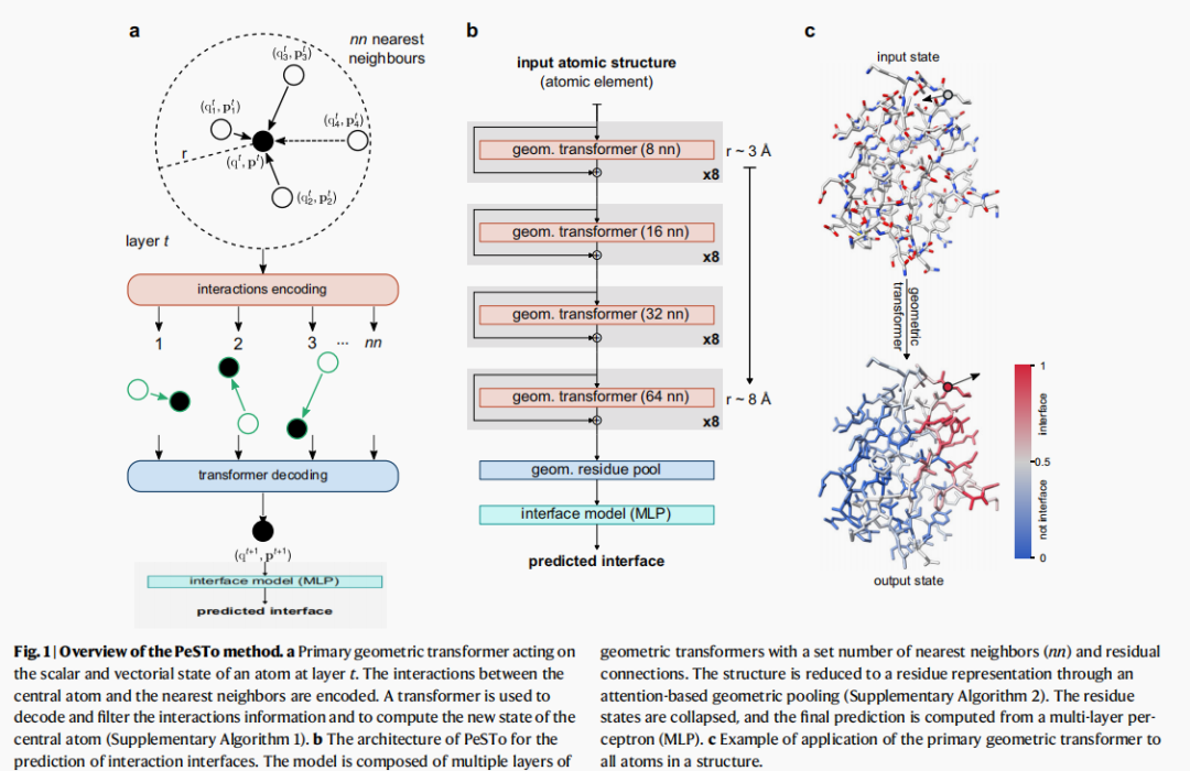 PeSTo的开发为研究蛋白质相互作用提供了一个强大的工具,有助于深入理解蛋白质的功能和相互作用机制。它不仅能够提高预测的准确性和速度,还能应用于大规模的结构数据分析,从而推动生物医学研究的发展。通过PeSTo,研究人员可以更有效地发现隐秘的相互作用界面,并对人类界面组进行详细分析,这对于药物设计、疾病机制研究等领域具有重要意义。2 模型方法