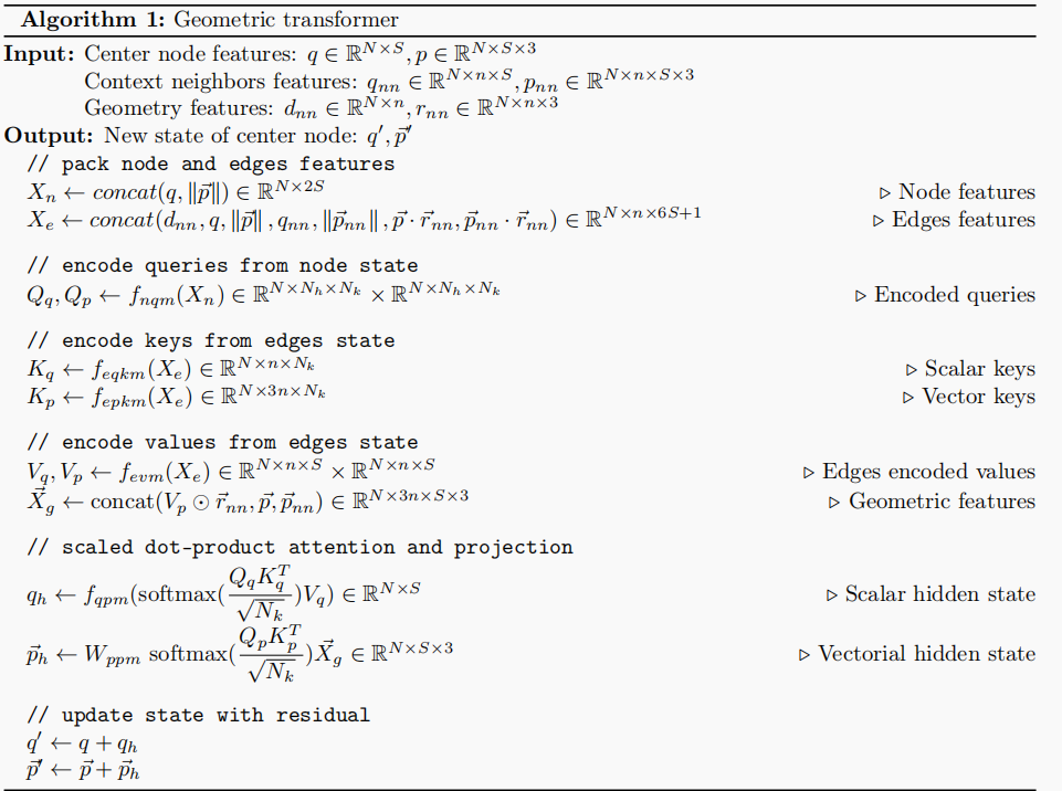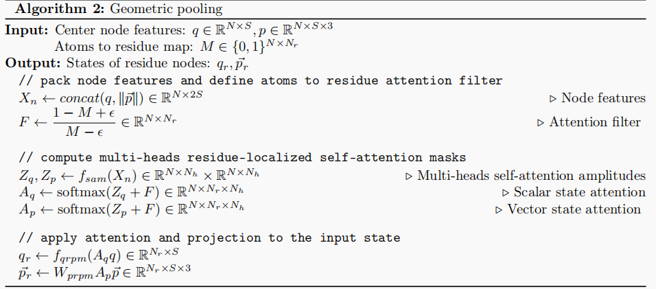 这个算法主要介绍了几何池化的原理。首先,经过几何Transformer更新后的中心原子的标量状态和向量状态被拼接形成节点特征Xn。通过原子到残基的映射M生成一个注意力过滤器F,这个过滤器用于调整后续注意力机制中的权重,使得节点能够根据其所属的残基来获得不同的注意力。