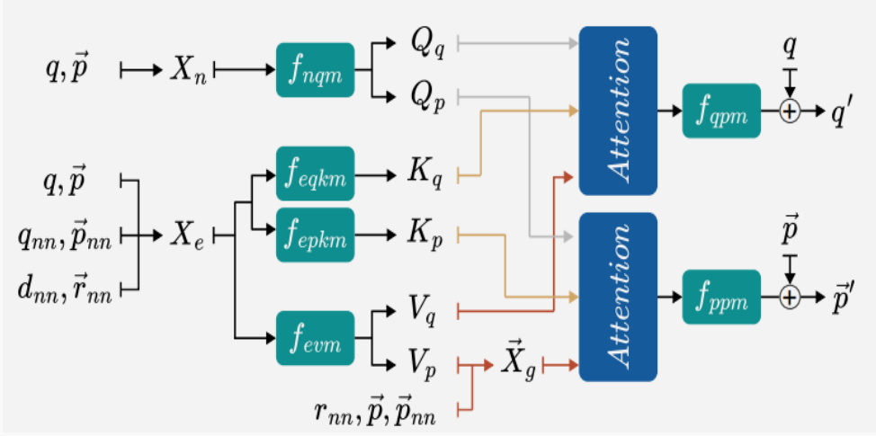 在模型的具体实现过程中,首先从中心原子及其邻居原子的特征向量中提取出节点特征Xn和边特征Xe。中心节点特征通过节点查询模型(fnqm)生成查询Qq和Qp。边节点特征则通过编码标量键模型(feqkm)和编码向量键模型(fepkm)生成键Kq和Kp以及值Vq和Vp。
