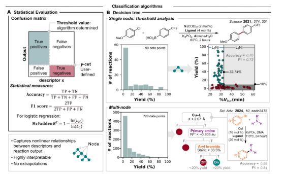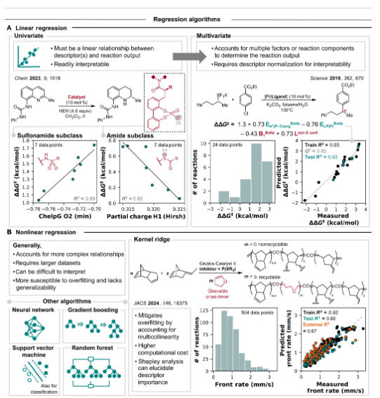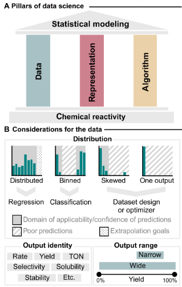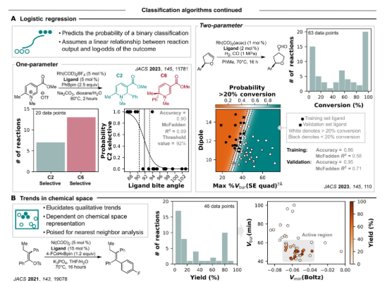 统计建模在有机化学中的应用正成为探索结构-活性关系和作为多种优化目标预测工具的标准实践。有鉴于此,犹他州立大学Brittany C. Haas, Dipannita Kalyani, 以及Matthew S. Sigman等人合作在Science Advances期刊上发表了题为“Applying statistical modeling strategies to sparse datasets in synthetic chemistry”的最新论文。本文旨在为进入化学统计建模领域的人员提供教程。作者通过案例研究,突出展示了在低数据样本情况下,如何成功分析数据集的考虑因素和方法,这在有机化学实验的实际需求中是常见的情形。统计建模依赖于数据(建模的对象)、描述符(数据的表示方式)和算法(数据的建模方式)。在本文中,作者重点讨论了各种反应输出(例如产率、速率、选择性、溶解度、稳定性和周转数)以及数据结构(例如分箱数据、严重偏斜数据和分布数据)如何影响选择用于构建预测性和具有化学洞察力的统计模型的算法。1. 首次探讨统计建模在有机化学中的应用,提出其作为探索结构-活性关系和优化目标预测工具的标准实践。2. 介绍了统计建模的三个关键支柱:数据、描述符和算法,强调了如何根据不同的反应输出(如产率、速率、选择性等)和数据结构(如分箱数据、偏斜数据)选择合适的建模算法。3. 案例研究展示如何在低数据样本情况下进行有效分析,特别是在有机化学实验中常见的稀疏数据问题。通过这些实例,讨论了如何从稀疏数据中提取有价值的信息。4. 探讨了机器学习在化学中的适用性,指出分类算法更适用于发现化学,而回归算法更适合过程化学中的精确预测。5. 统计建模在学术和工业中的双重优势,通过多项成功的工业与学术合作,证明了其对工业化学家的应用价值。6. 强调了模型的平衡性,即在推动传统统计建模方法的边界时,仍需扎根于物理有机化学的基础,最终实现稀疏数据集的最佳统计建模。总之,正如本文所详细描述的,建模稀疏数据集需要考虑许多因素,统计建模的过程以及选择最佳模型都不是简单的。通常,作者的决策是在化学家的化学直觉下进行的,“实践中的化学家”参与其中;根据项目目标,作者可能会选择牺牲模型的统计性能或预测能力,以便提高可解释性。尽管化学反应性的统计建模主要由学术实验室使用,但它对工业化学家也具有优势,正如许多成功的工业与学术合作所展示的那样。从经验来看,作者观察到,分类算法的通用性更适用于发现化学,而回归算法则更为精确,常被过程化学家使用。最终,针对稀疏数据集实现最佳统计模型,需要在推动传统统计建模(即机器学习)方法的边界的同时,保持对有机化学的物理基础的扎实理解。Brittany C. Haas et al. ,Applying statistical modeling strategies to sparse datasets in synthetic chemistry.Sci. Adv.11,eadt3013(2025).DOI:10.1126/sciadv.adt3013🏅 我们提供专业的第一性原理、分子动力学、生物模拟、量子化学、机器学习、有限元仿真等代算服务。🎯我们的理论计算服务,累计助力5️⃣0️⃣0️⃣0️⃣0️⃣➕篇科研成果,计算数据已发表在Nature & Science正刊及大子刊、JACS、Angew、PNAS、AM系列等国际顶刊。👏👏👏