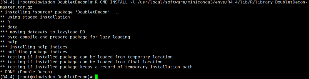 # bash终端操作 conda activate R4.4 tar -zcvf DoubletDecon-master.tar.gz DoubletDecon-master# 安装 R CMD INSTALL -l /usr/local /software/miniconda3/envs/R4.4/lib/R/library DoubletDecon-master.tar.gz