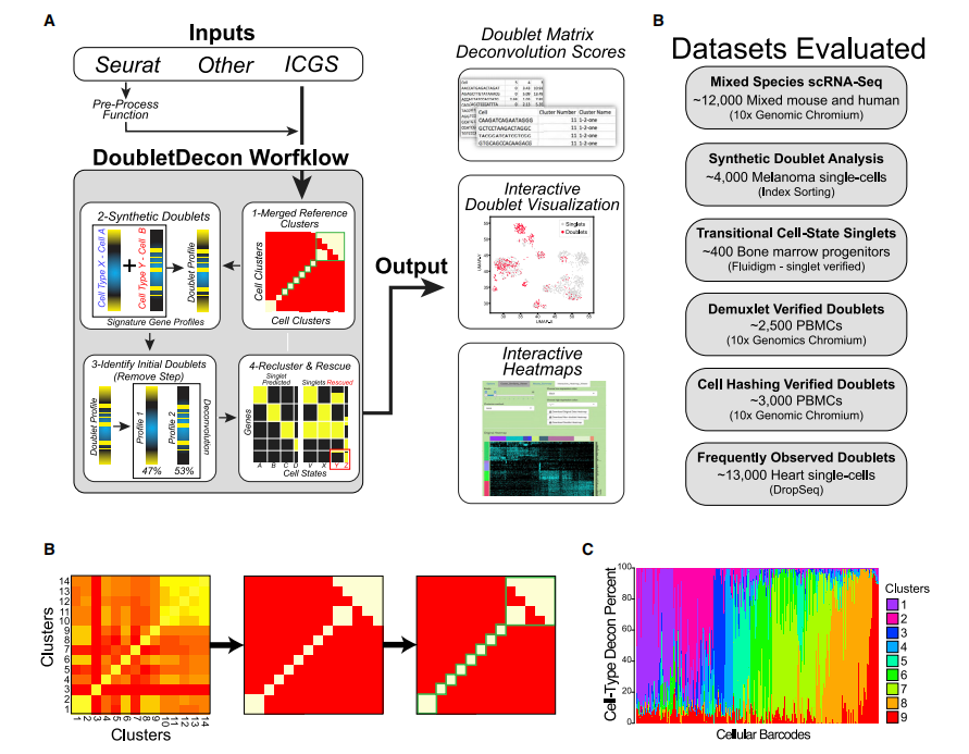 DoubletDecon通过去卷积的方法来识别并去除单细胞RNA测序(scRNA-seq)数据中的双细胞(doublets)。 保留双细胞(doublets)可能会干扰数据分析和细胞亚群的识别。 DoubletDecon可以识别过渡细胞和祖细胞避免被错误去除。 该算法能够识别出与其他方法相比独特的双细胞(doublets)。 原理示意图如下: