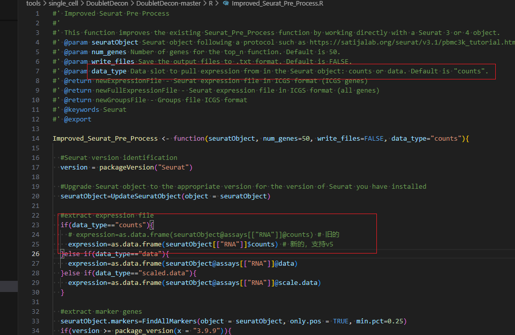 改动 包中 DoubletDecon-master/R/Improved_Seurat_Pre_Process.R 函数的取值方式: