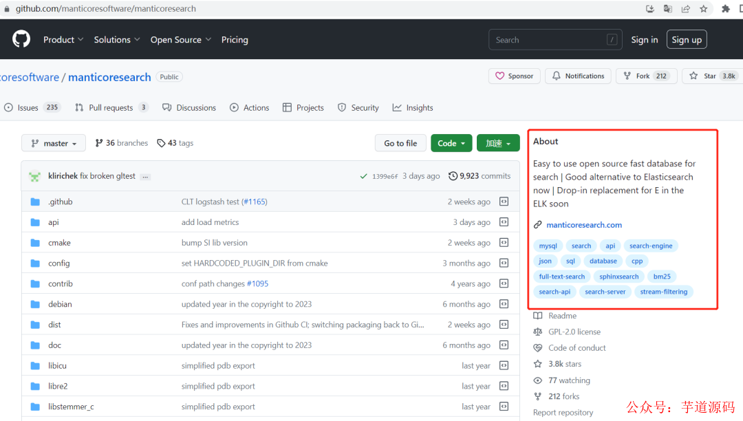 Manticore Search 是一个使用 C++ 开发的高性能搜索引擎,创建于 2017 年,其前身是 Sphinx Search 。Manticore Search 充分利用了 Sphinx,显着改进了它的功能,修复了数百个错误,几乎完全重写了代码并保持开源。这一切使 Manticore Search 成为一个现代,快速,轻量级和功能齐全的数据库,具有出色的全文搜索功能。
