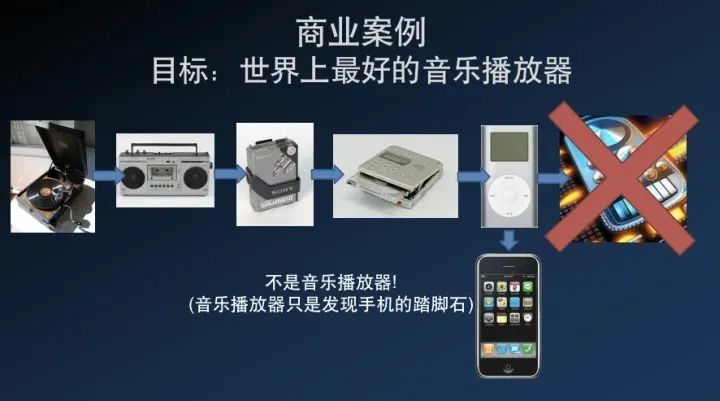 再举一个商业案例,二十世纪七八十年代出现了电唱机,盒式磁带、音箱和各种盒式磁带播放器,之后是随身听、CD随身听和iPod。iPod是苹果公司发布的一种革命性的音乐播放器,但苹果的目标不是作出最好的音乐播放器,iPod成了一块通往iphone的踏脚石,最终那个引领性的产品是一部手机。