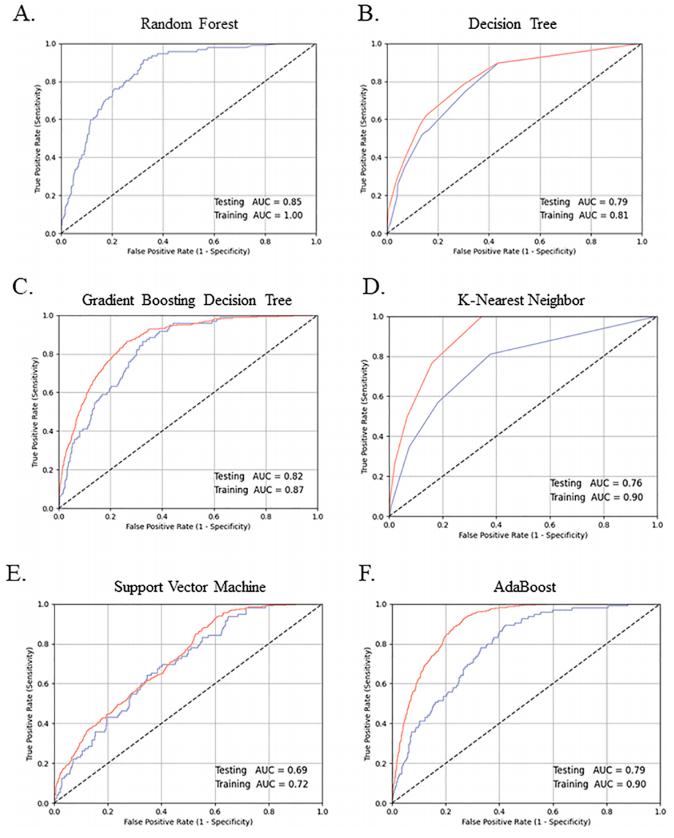 研究比较了随机森林(RF)、决策树(DT)、梯度增强决策树(GBDT)、K近邻(KNN)、支持向量机(SVM)和AdaBoost(AB)六种机器学习模型(图1)。基于4600名参与者的数据,分析了模型的AUC值、准确率、精确度和F1分数。结果显示,随机森林模型表现最佳,准确率为90.00%,精确度为0.91,F1分数为0.86。