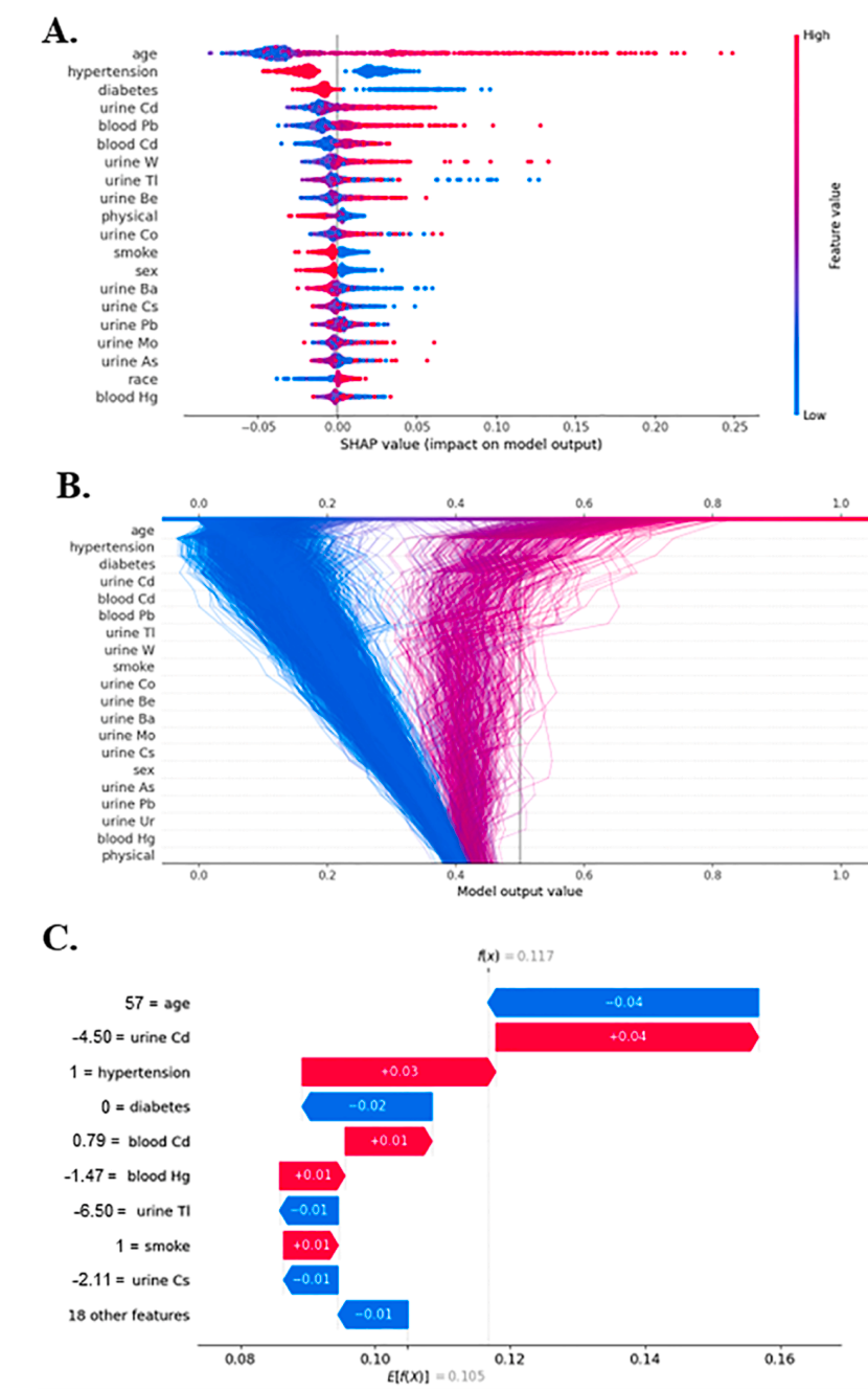 图5展示了随机森林(RF)模型的SHAP值分析,揭示了年龄、尿液中的镉(Cd)、血液中的铅(Pb)和尿液中的钨(W)对心血管疾病(CVD)风险的正向影响,而尿液中的铊(Tl)则有负向影响。此外,高血压和糖尿病也被识别为增加CVD风险的因素。