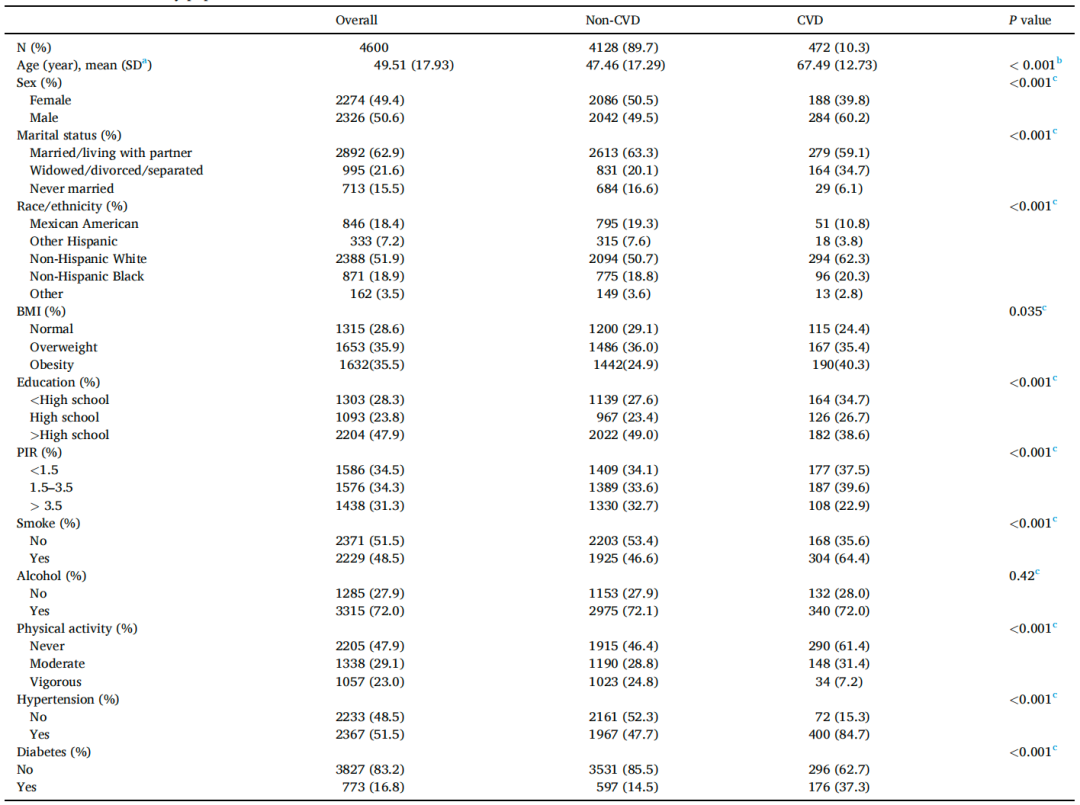 研究纳入了4600名平均年龄49.51岁的成年人(表1),发现10.3%患有心血管疾病(CVD)。研究使用机器学习方法,基于参与者的重金属暴露数据,分析了年龄、性别、种族、教育等特征,结果显示CVD患者中男性比例高,教育程度低,且高血压和糖尿病发病率更高。