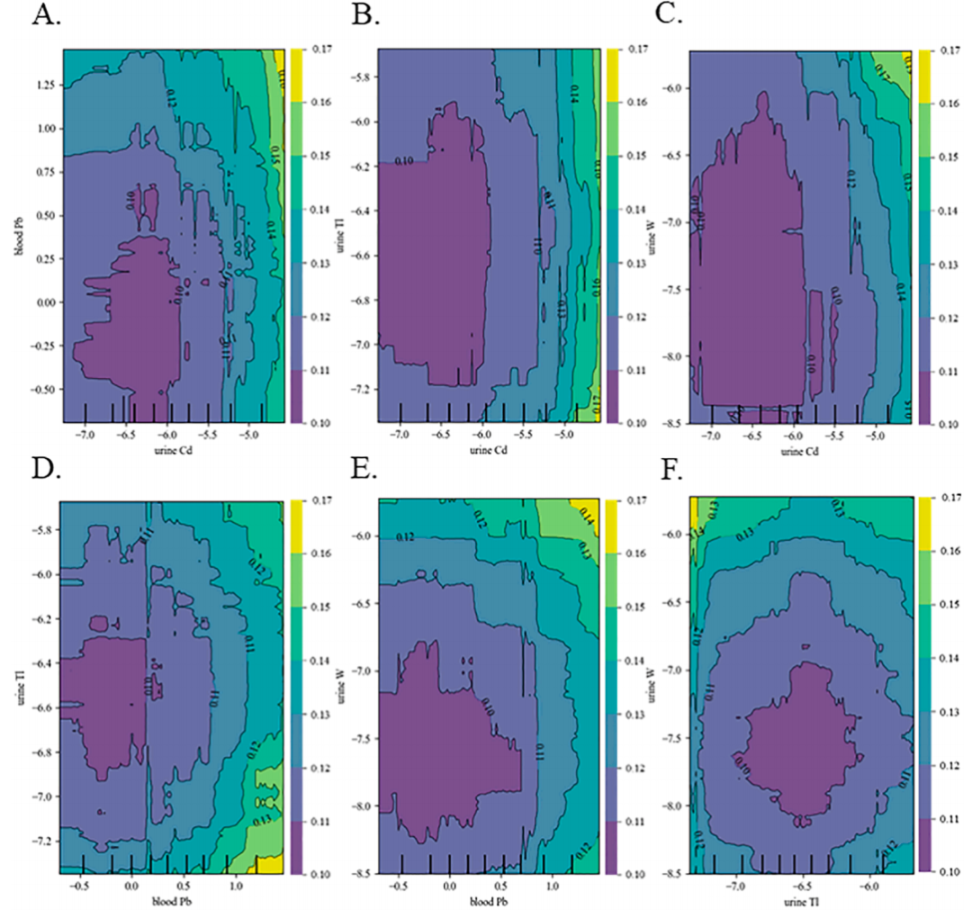 研究了尿液中的镉(Cd)与其他三种金属(铅Pb、铊Tl和钨W)对心血管疾病(CVD)风险的协同影响(图4)。通过部分依赖图(PDP)分析,发现尿液Cd水平在-6.0至-4.5μg/g范围内时,对CVD风险的预测影响最大。结果显示,随着尿液Cd和Pb水平的升高,CVD风险增加,而尿液Cd水平的调节可能对心血管疾病的管理至关重要。