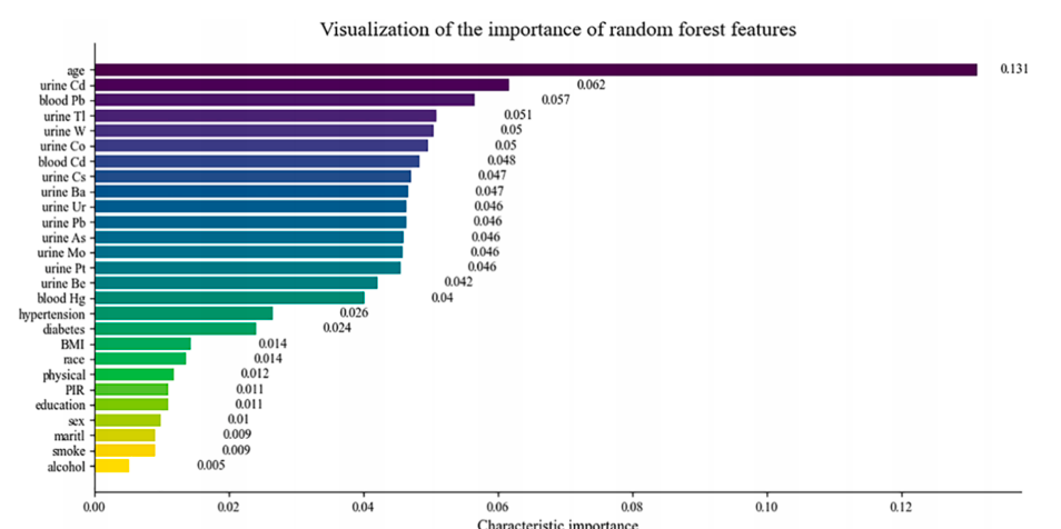 研究中使用了随机森林模型来分析影响心血管疾病的因素(图2)。通过特征重要性分析,发现年龄、尿液中的镉(Cd)、血液中的铅(Pb)、尿液中的铊(Tl)和尿液中的钨(W)是预测心血管疾病的五个最重要因素,它们的重要性得分分别为0.131、0.062、0.057、0.051和0.05。这些结果表明,年龄是预测心血管疾病最关键的因素。
