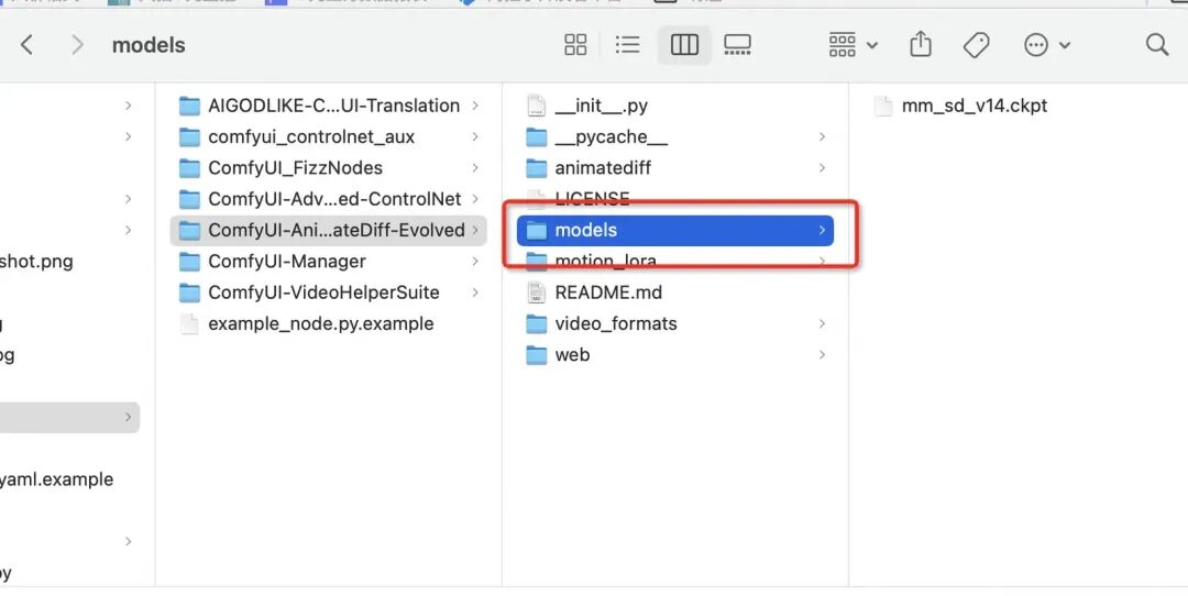 在下载完模型后,我们需要将模型导入到 ComfyUI 的 models 目录下,这样 ComfyUI 才能够加载到对应的模型。