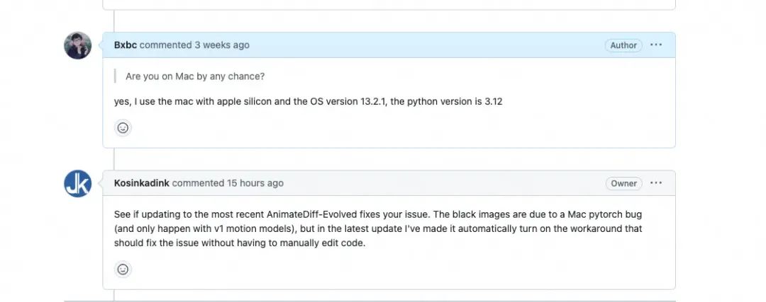 在AIGC时代,更能体会到开源精神的可贵。当我使用文生动图插件【ComfyUI-AnimateDiff-Evolved】:https://github.com/Kosinkadink/ComfyUI-AnimateDiff-Evolved时,刚开始老是跑不出一张有效的动图,自己排查问题无果后,我去作者的git仓库下提了 issue,没想到很快获得了解答。作者近期更新了自己的代码来适配 Mac pytorch 的 bug,还是很感动有这样的开源贡献者。因为问题得到了解决,我也得以完成了这篇ata最后的拼图,在此感谢作者。