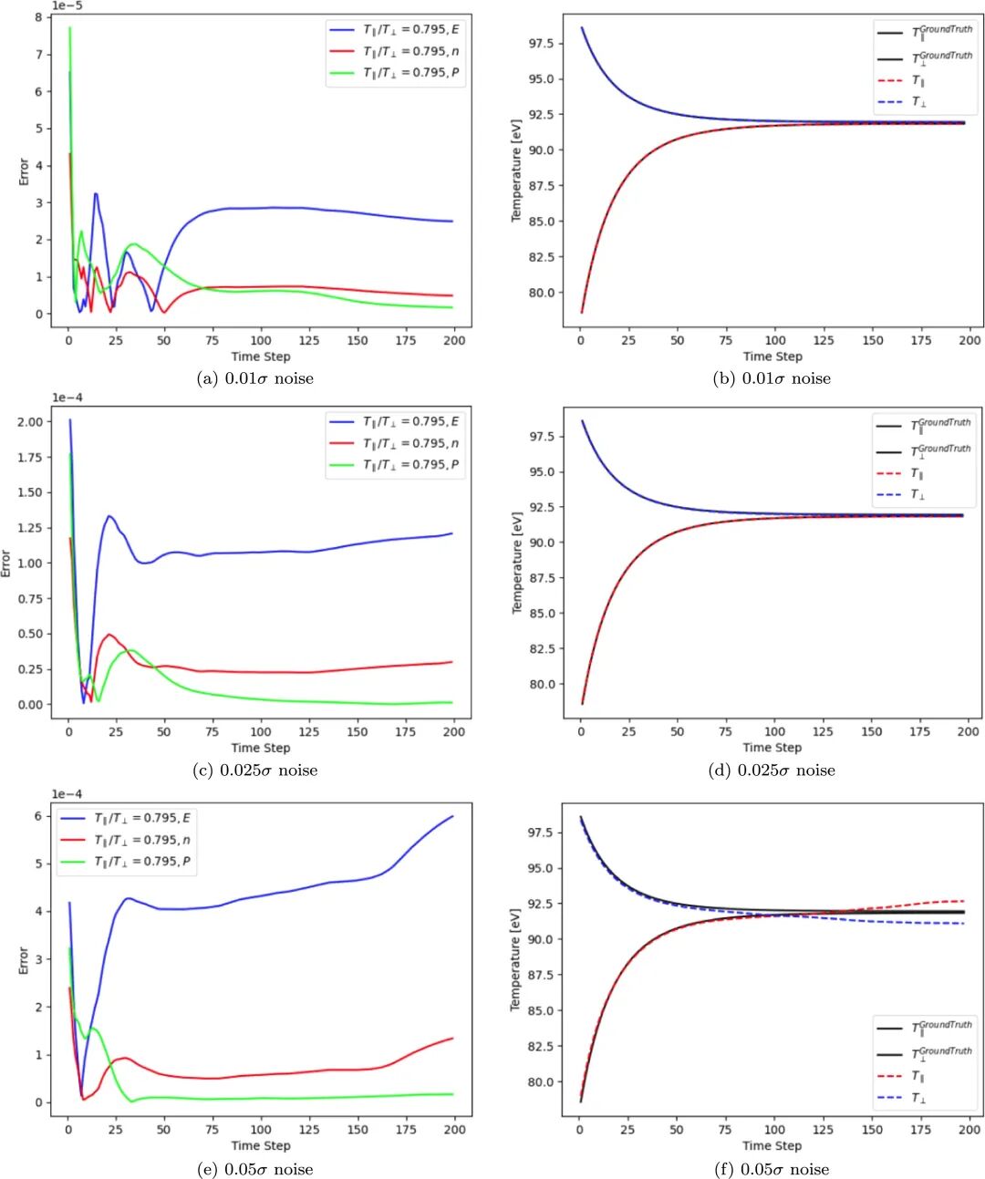 在高斯噪声测试中,向输入添加了相当于输入标准差 1%、2.5% 和 5% 的噪声,结果显示噪声水平不超过 2.5% 时,误差不会随时间步增长而发散,温度松弛能够成功实现。