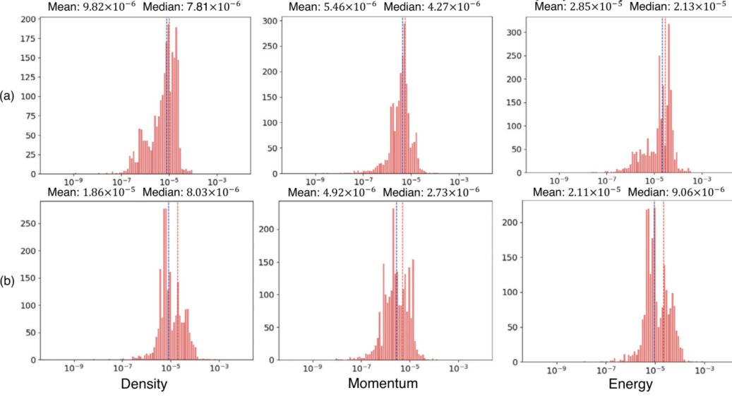 经过测试,FPL-net 在保持误差控制在 10⁻⁵ 量级的同时,展现出卓越的计算效率。在测试数据集上的 2189 个测试案例中,密度误差平均为 9.82×10⁻⁶,中位数为 7.81×10⁻⁶;动量误差平均为 5.46×10⁻⁶,中位数为 4.27×10⁻⁶;能量误差平均为 2.85×10⁻⁵