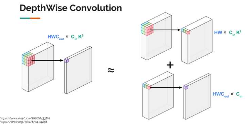 今年谷歌提出的MobileNet,利用了一种被称为DepthWise Convolution的技术,将神经网络运行速度提升许多,它的核心思想就是把一个卷积操作拆分成两个相对简单的操作的组合。如图所示, 左边是原始卷积操作,右边是两个特殊而又简单的卷积操作的组合(上面类似于池化的操作,但是有权重,下面类似于全连接操作)。