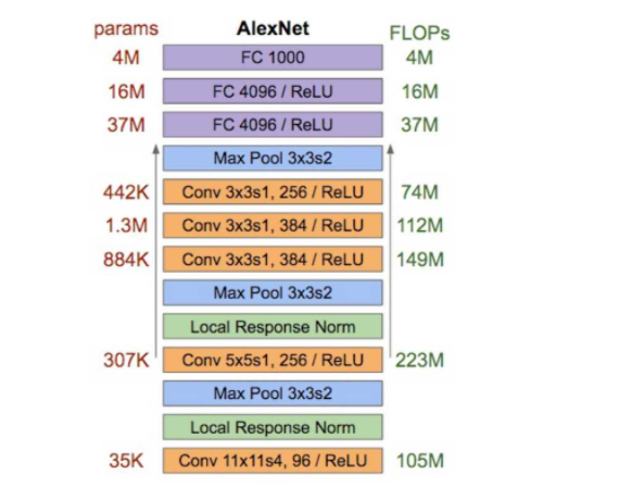 AlexNet的分析如下图,左边是每一层的参数数目(不是显存占用),右边是消耗的计算资源