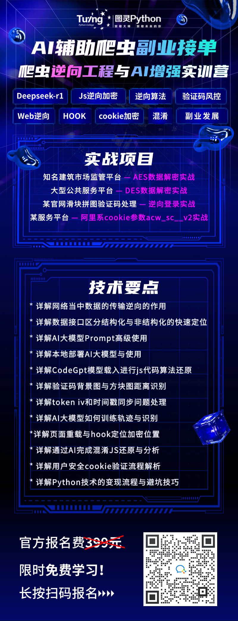 想要速成爬虫,尤其是可用于变现的高阶技术,野路子的自学就大可不必了,我建议直接来听一堂AI辅助爬虫逆向实训营。