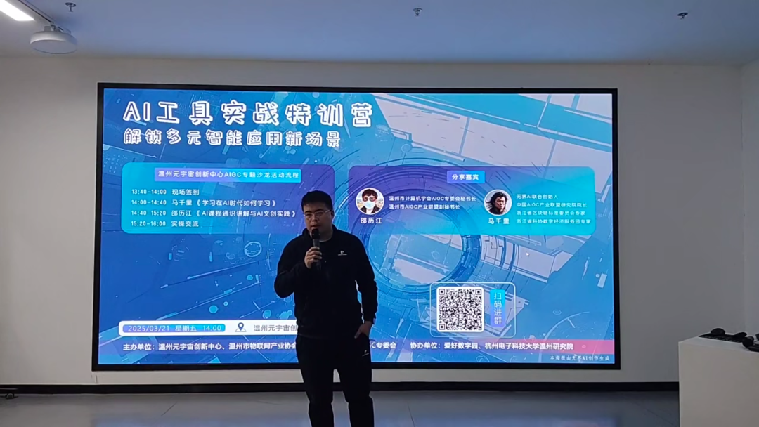 本次【AI 工具实战特训营:解锁多元智能应用新场景】AIGC专题沙龙活动活动由温州元宇宙创新中心联合温州市物联网产业协会、温州市计算机学会 AIGC 专委会主办,爱好数字园、杭州电子科技大学温州研究院协办。在人工智能蓬勃发展的当下,众多 AI 工具不断涌现,为企业创新与创业者突破带来无限可能,此次沙龙应运而生,旨在助力参与者深度体验并熟练掌握热门 AI 工具的应用技巧。