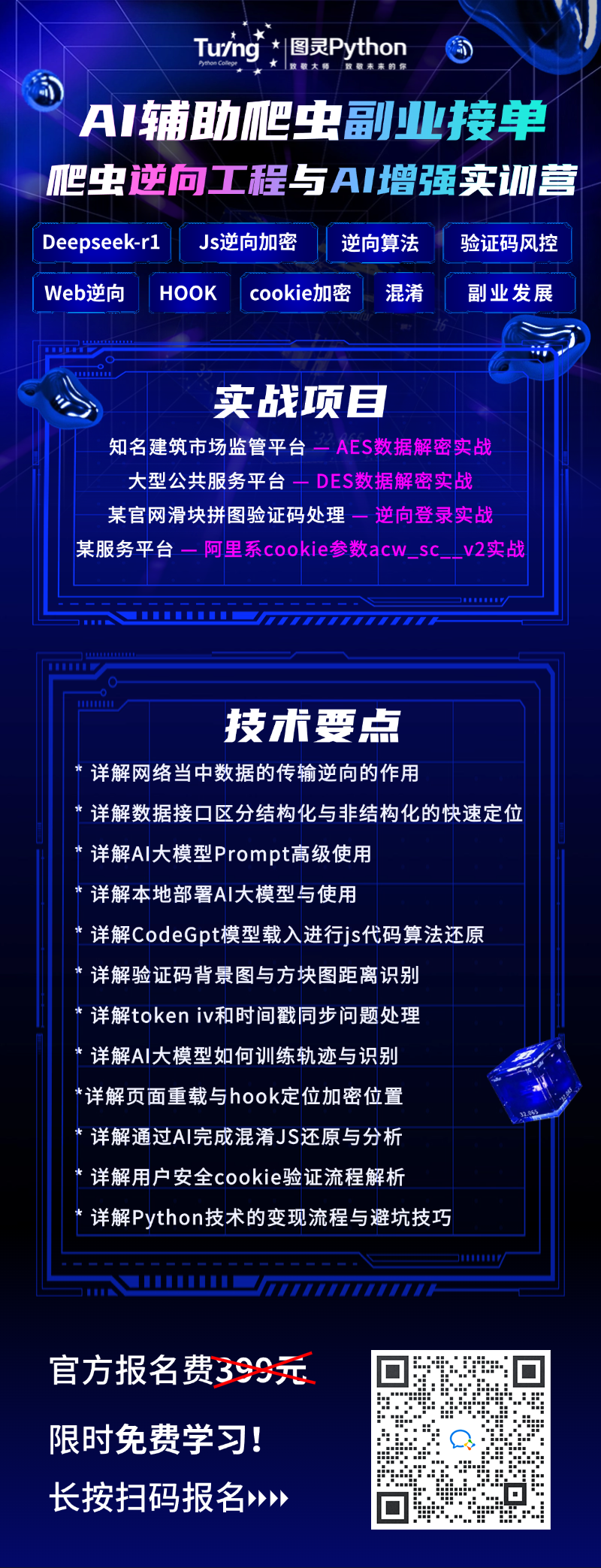 想要速成爬虫,尤其是可用于变现的高阶技术,野路子的自学就大可不必了,我建议直接来听一堂AI辅助爬虫逆向实训营。