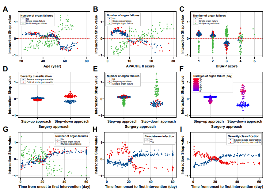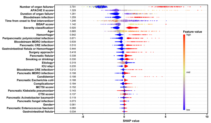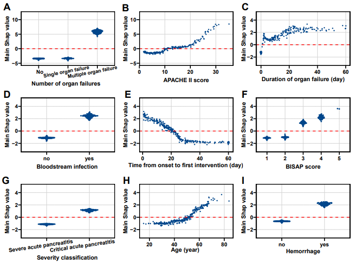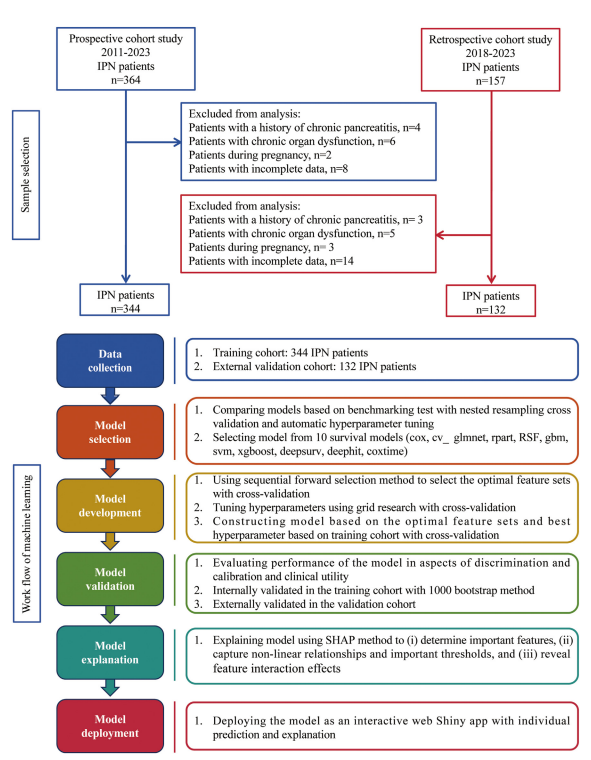 附加价值:据团队所知,这是首次且最大规模的针对感染性胰腺坏死患者的死亡率,比较10种机器学习模型,并开发一个具有最佳预测性能的可解释机器学习模型的研究。(10种机器学习算法都专门基于生存分析)此外,本研究还首次提供了两个可公开访问的网络工具,以促进基于机器学习的感染性胰腺坏死死亡率预测模型的临床应用。