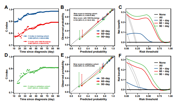 Fig 3 随机生存森林模型与最佳特征集在训练队列(A, B, C)和外部验证队列(D, E, F)的表现
