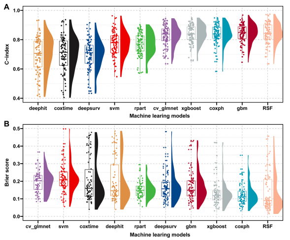 Fig 2 10个基于C指数(A)和Brier评分(B)的机器学习模型选择