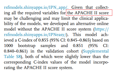 考虑到收集 APACHE II 评分所需的所有变量可能具有挑战性,并且可能会限制模型的临床适用性,开发没有APACHE II 评分系统的替代在线模型。两个在线交互模型网址都包含shinyapps,表示其为借助shiny方法搭建。