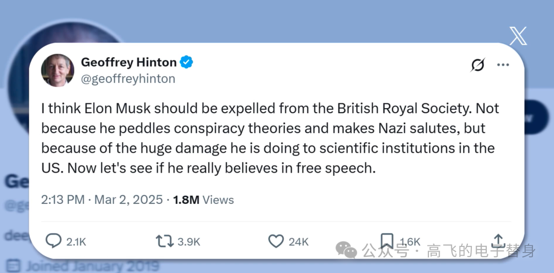 Paikin提到辛顿在X平台(前Twitter)上发表的一条评论:"我认为埃隆·马斯克应该被开除出英国皇家学会,不是因为他兜售阴谋论和邪恶敬礼,而是因为他对美国科学机构造成的巨大伤害。现在让我们看看他是否真的相信言论自由。"
