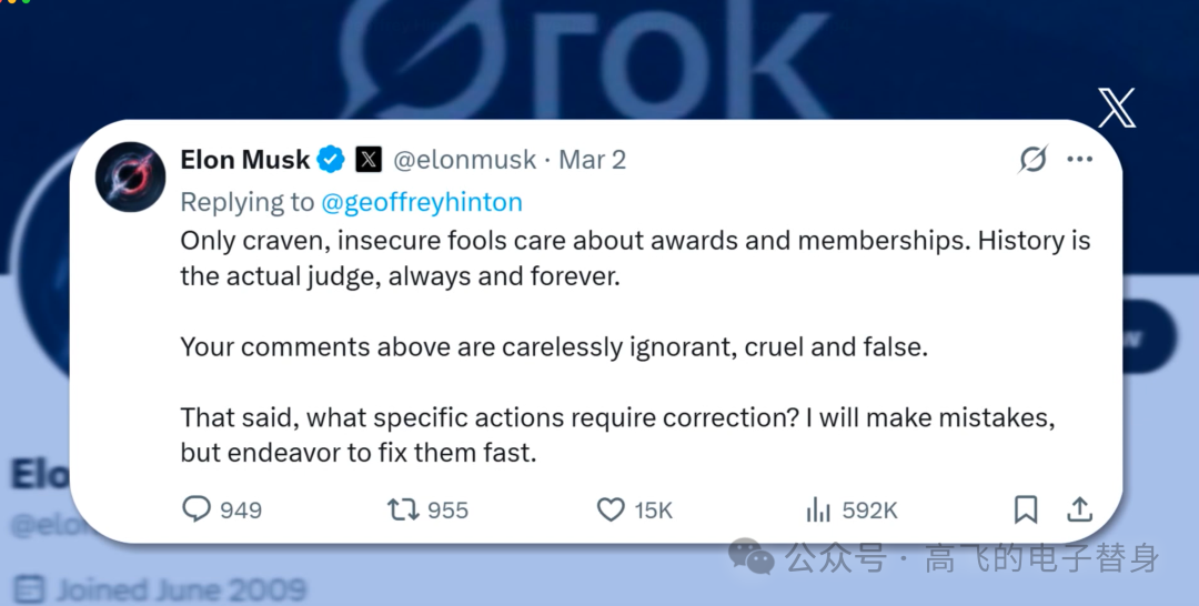 马斯克的回应是:"只有懦弱、不安全的傻瓜才会在乎奖项和会员资格。历史是真正的裁判,永远如此。你上面的评论是粗心、无知、残忍和虚假的。话虽如此,有什么具体行动需要纠正?我会犯错,但会努力迅速修正。"
