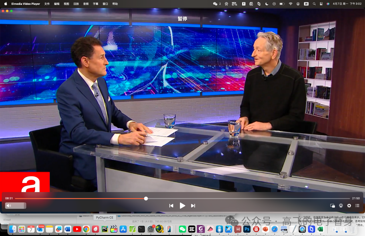 这次他参加的是TVO电视访谈节目,接受了主持人Steve Paikin(史蒂夫·派金)的采访。作为多伦多大学计算机科学荣誉教授,据说是这次拿了诺奖才有一个独立的办公室,访谈也就从他获得诺贝尔奖的喜悦开始,然后聊到他对人工智能短期和长期威胁的深切担忧,以及他最近与首富埃隆·马斯克的公开争论等多个话题。由于辛顿有腰伤,所以他基本上不能长时间坐着,上图也能显示出主持人是作者的,他是站着的。