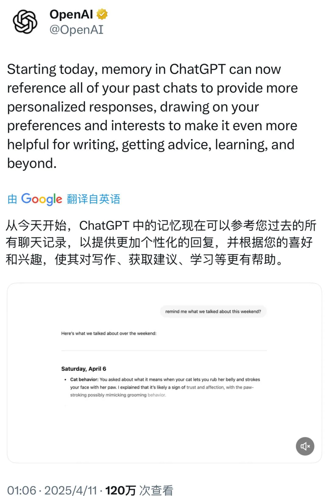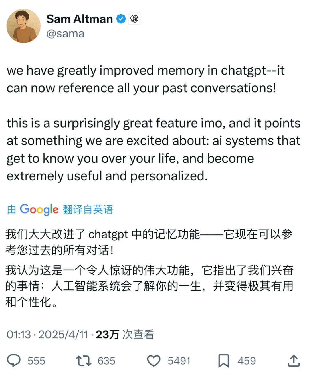 根据 OpenAI 联合创始人 Sam Altman 在 X 上的帖子,这个功能被认为是“非常棒的”,因为这个功能的升级意味着 AI 未来可能更深入了解用户的生活。