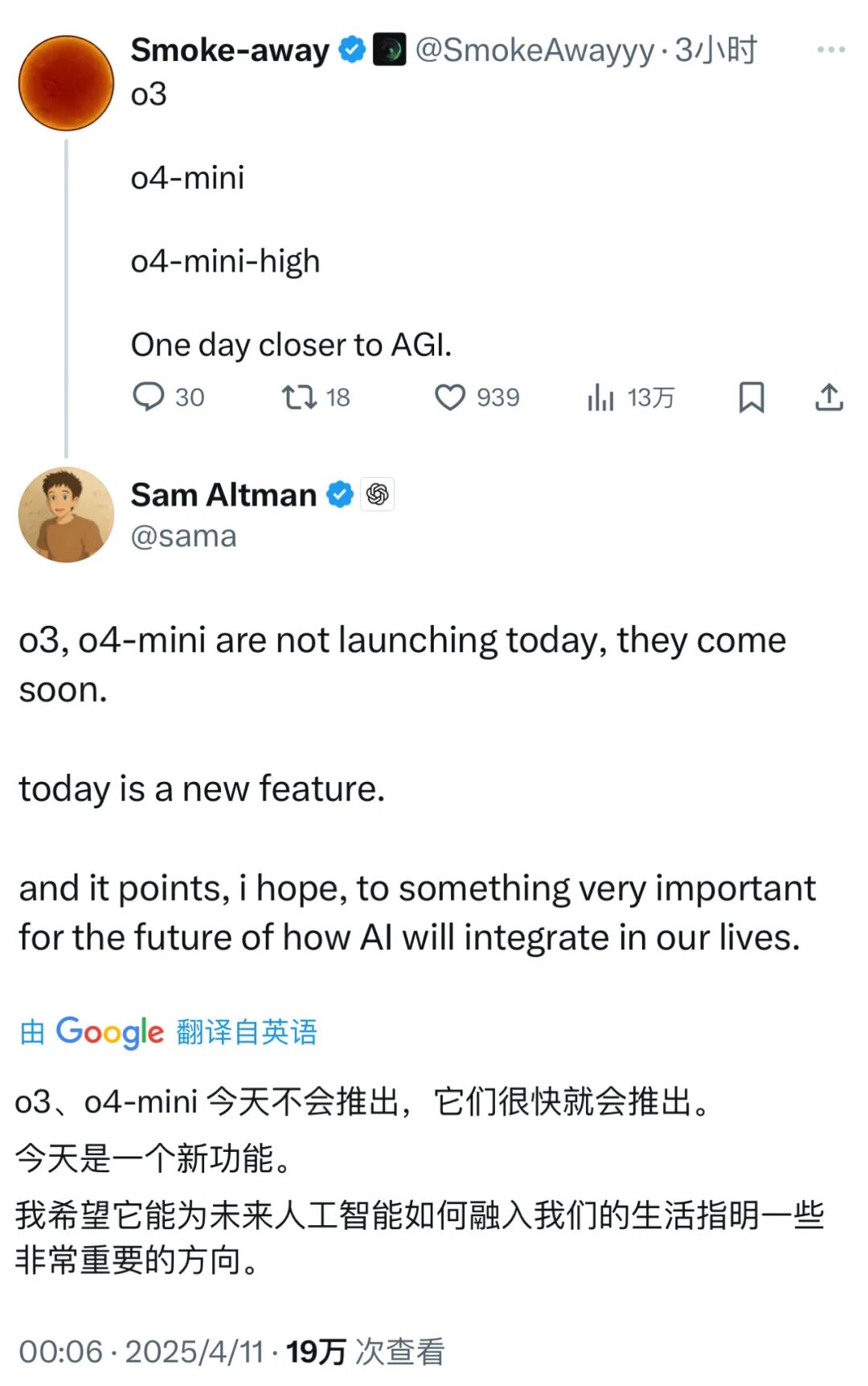 我半夜起来给孩子喂奶的时候,打开 X 一看,山姆·奥特曼又在深夜作妖,说自己很兴奋,为什么很兴奋呢?因为 ChatGPT 又有重大功能升级了,大家都纷纷猜测是 “o4-mini”、“o4-mini-high”和“o3” 要来了。