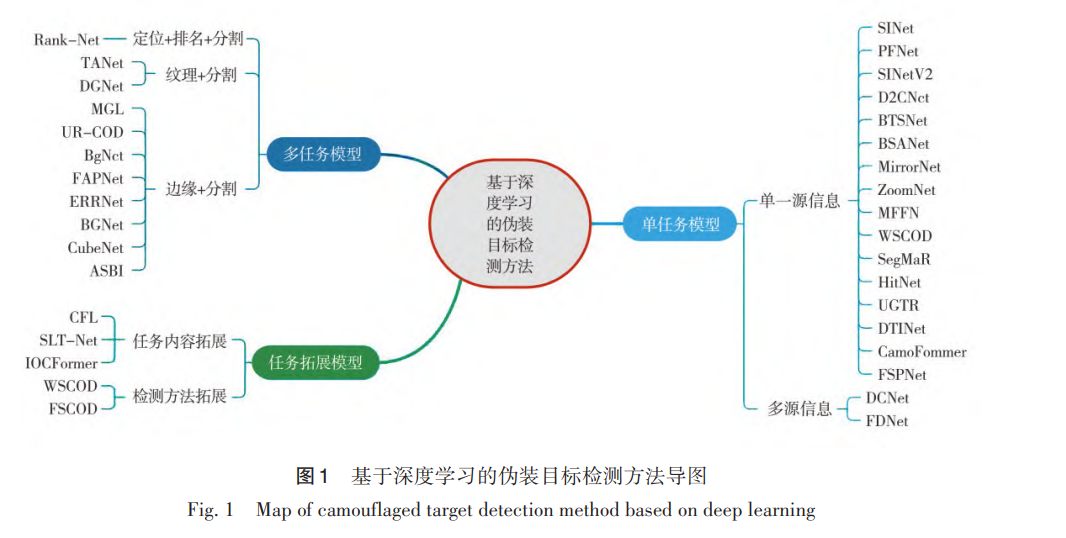 摘 要:伪装目标检测是一个新兴的研究方向,在计算机视觉领域引发了广泛关注。现有大多数工作以构建 高效的检测模型为目的,缺少对已有模型的深入分析及归纳总结。因此,对现有基于深度学习的伪装目标检测模 型进行全面分析和总结,并探讨伪装目标检测潜在的研究方向。对基于深度学习的已存模型进行全面综述,并详 细阐述相关模型的原理和优劣势;介绍伪装目标检测领域常用数据集及评价指标;对现有基于深度学习的伪装目 标检测模型进行复现,并对不同类型模型在公开数据集上的检测结果进行定性和定量比较;对伪装目标检测领域 的未来研究方向进行展望。 关键词:伪装目标检测;深度学习;数据集;评价指标专知便捷查看,访问下面网址或点击最底端“阅读原文”